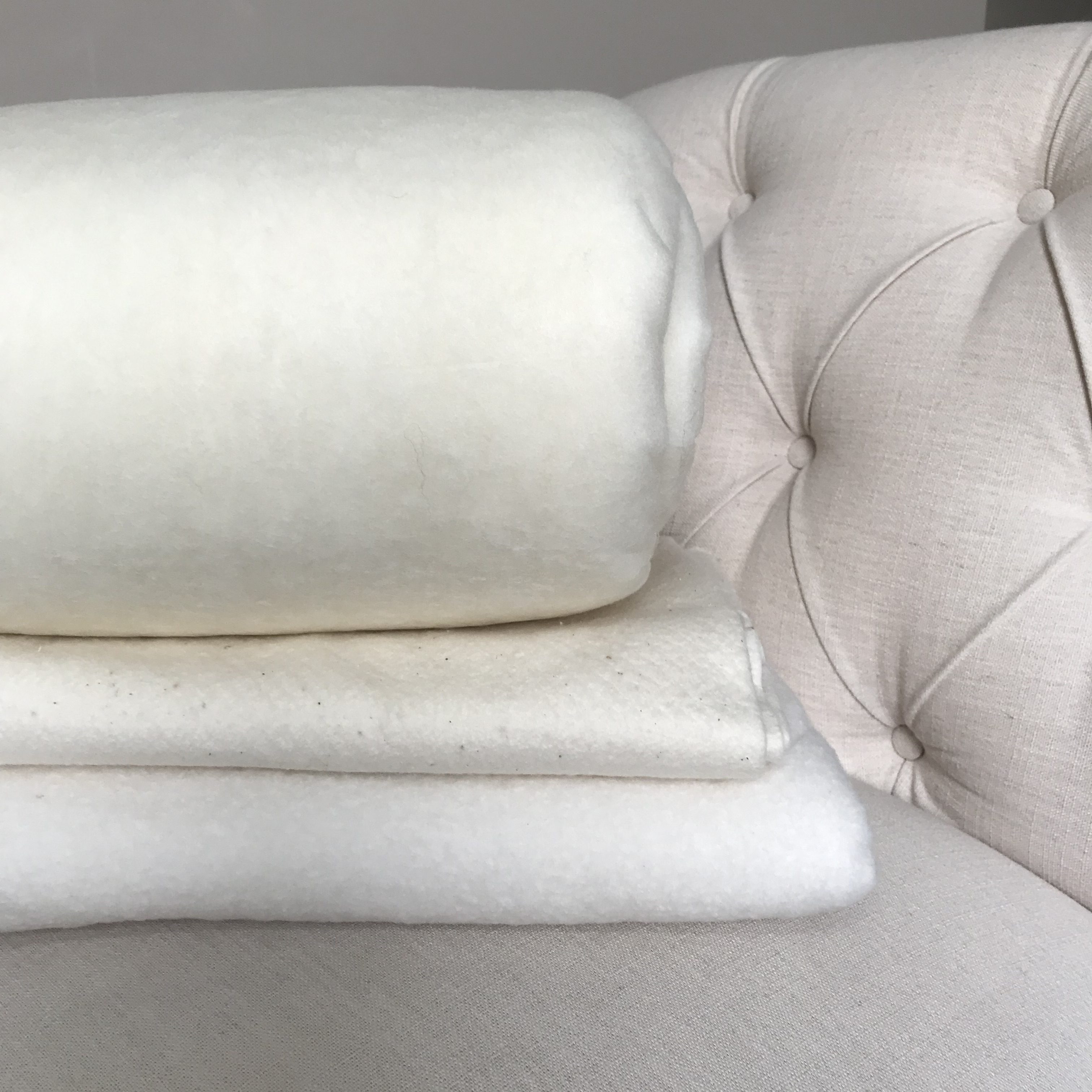 I carry Hobbs 80/20 (80% cotton/20% polyester), 100% cotton and 10% bleached cotton batting. I am also happy to order specialty battings (like wool) and can give you a price on that, if desired.